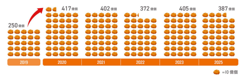全国のから揚げ消費個数を推計で算出したところ、今年の年間消費量は約380億個以上となる見込み。一昨年調査との比べでは約95%程度に留まることが分かった。