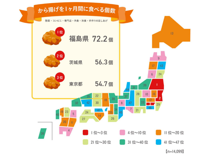 から揚げを1ヵ月間に食べる平均喫食個数(一人当たり)を推計(聴取したから揚げ喫食頻度に1回で食べる個数を掛け合わせて1ヵ月間平均喫食個数を算出)すると、今年最も多かったのは「福島県(72.2個)」。次いで「茨城県(56.3個)」「東京都(54.7個)」「鹿児島(52.4個)」「大分県(51.4個)」となった。福島県はこれまで上位に位置付けていたが1位獲得は初めて。色々なタイプのから揚げを喫食していると回答。2位と15個以上大差をつける結果となった。