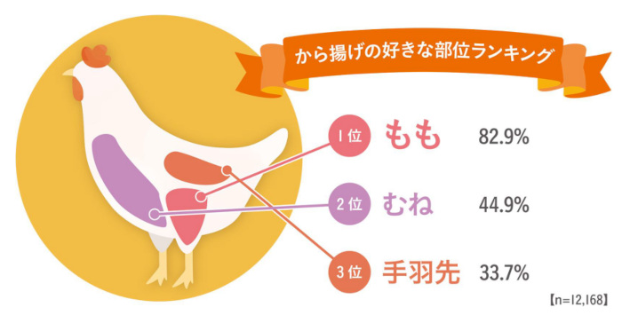 から揚げの好きな部位をみると、5回連続で「もも(82.9%)」「むね(44.9%)」「手羽先(33.7%)」の順。「もも」は比較的女性の支持が多く、「むね」は比較的男性の支持が多かった。