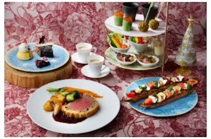 「ザ・ロビーラウンジ」で提供するクリスマスディナーでは、伝統的なクリスマスの雰囲気を感じながら、特別な夜を迎えてもらえる。ロブスターのタルティーヌ、たっぷりのいくらを乗せたサーモンロール、蟹のカクテルなど、冬に旬を迎えるシーフードをふんだんに取り入れた前菜は、トリュフなどの贅沢な食材とともに、まるでアフタヌーンティーのようにスタンドに美しく盛り付けられている。メインには、イギリスのホリデーシーズンを象徴する伝統料理「ビーフウェリントン」を用意した。パイの中で蒸し焼きにされた柔らかな牛フィレ肉に、芳醇な赤ワインソースを添えて仕上げた。デザートには、クリスマスの定番スイーツ「ブッシュ・ド・ノエル」をはじめ、「レアチーズケーキのスノーマン」や「ベリーのコンポート」が、聖夜の締めくくりを華やかに演出する。