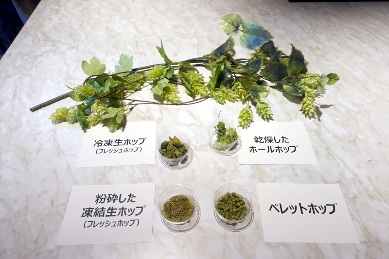 「岩手県遠野市で収穫したての生ホップを急速凍結して使用する『凍結粉砕ホップ』は、キリンの特許技術となっている。生のまま凍結したホップは、青草や果実のようなフローラルな香りが際立つ。日本で良質なホップが栽培されているからこそ可能な、世界でも例をみないホップの使い方となっている」と紹介する。「ビールは、麦芽・副原料・ホップ・水・酵母という限られたシンプルな素材だけから造られる飲み物。一つひとつの素材の違いが多彩なスタイルと味わいを生み出す。中でも苦み・香り・泡持ち・殺菌効果を担うホップの役割は非常に重要(出典:HOP Master File 基本情報(1st edition 2017oct)」と、ビール造りに欠かせないホップの役割について言及。「ビールになるために、ホップが果たす役割は、苦みを与える、香りを与える、泡持ちをよくする、殺菌効果を与える」と説明した。