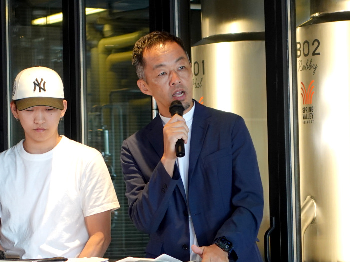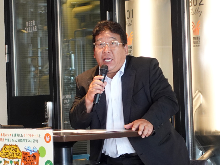 再び、井本社長が登壇し、今年の日本産ホップ推進活動について発表した。「SVBは、2015年開業以来、『日本産ホップ推進活動』に参画し、全国のホップ生産者への情報提供や、ビール醸造家への技術的支援、さらに消費者の飲用体験創出などを行っている。SVBも一賛同ブルワリーとして、日本産ホップを使用したビールの拡大に取り組んでいる」と、日本産ホップ推進の取り組みにおける同社の役割について語る。「SVB創業10周年特別企画第5弾『ENJOY! CRAFT 恵みJAPAN 2025』では、日本の実りの秋に注目し、日本の恵みを活かしたクラフトビールと日本の食文化の新たな魅力を体験できる企画を展開。特に秋は、ビール醸造に欠かせないホップが収穫され醸造される、日本産ホップビールの最旬でもあることから、当企画を通じて、日本産ホップビールの魅力を届ける」と、イベントの主旨について発表した。