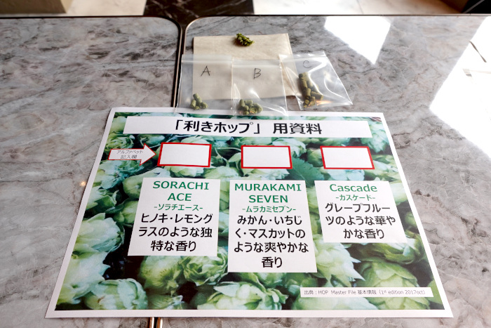 ホップについて理解したところで、「利きホップ」を実施。「利きホップ用資料」に記載している、3種類のホップの特徴を読む。そして、ジッパー付ビニール袋に入ったペレットホップを順に香る。最後に資料の「記入欄」に正解だと思う組み合わせを記入した。