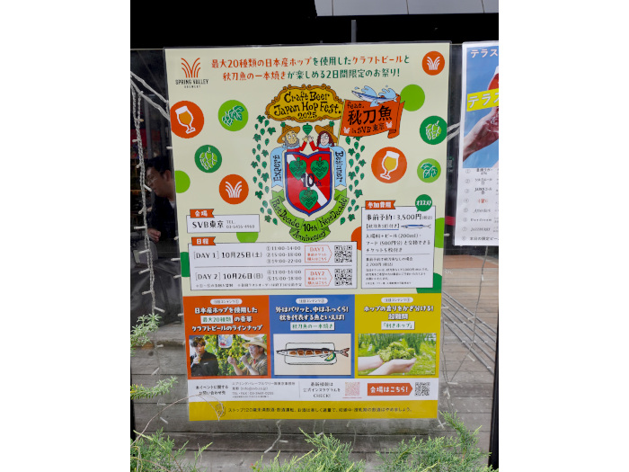 「クラフトビール ジャパンホップ フェスト 2025 feat.秋刀魚 in SVB東京」では、「秋が日本産ホップを楽しむ旬であることを知ってもらうために、季節を代表する食と記憶に残る体験内容を行う。10月25日、26日の2日間、17ブルワリーが参加し、最大20種の日本産ホップを使用したクラフトビールを提供する」と、自社でホップの栽培と醸造を行う二刀流のブルワリーや、ホップの生産者とコラボして醸造したブルワリーなど全国の注目ブルワリーが集結する。