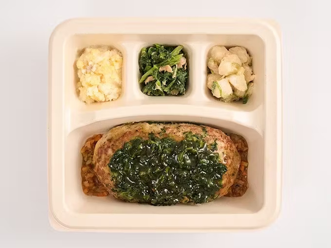 副菜には、主菜のソースとも相性抜群のたまポテサラダ、コクと旨みを味わえる春菊とツナのおひたし、シャキシャキ食感が楽しいやまいものごま和えを用意した。なお、レンジ加熱時に容器のふたを必ず3~4cmほどしっかり剥がして加熱してほしいという。