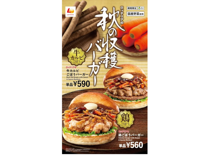 ロッテリア、“鶏ごぼう”と“牛カルビごぼう”で秋を感じる和風バーガーを販売する「秋の収穫バーガーフェア」を開催