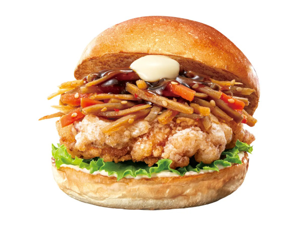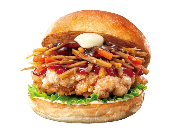 「鶏ごぼうバーガー」は、店内手仕込みのチキン竜田に、国産のごぼうとにんじんを使用したシャキシャキ食感のきんぴらを合わせ、ロッテリア特製てりやきソース、レタス、マヨネーズなどとともにふんわりもっちり食感のバンズで挟んだ商品。醤油ベースの味付けで素材の風味を活かしたきんぴらや、ジューシーな味わいのチキン竜田、焦がし醤油を使用したコク深い味わいの特製てりやきソースが織りなす、和風バーガーに仕上げた。