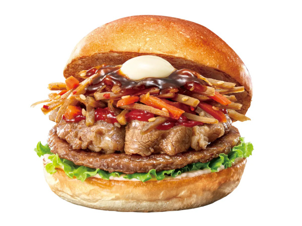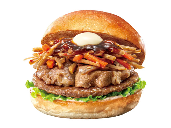 「牛カルビごぼうバーガー」は、ハンバーグパティに甘辛く味付けした牛カルビを合わせ、きんぴら、レタス、特製てりやきソース、マヨネーズなどとともにふんわりもっちり食感のバンズで挟んだ商品とのこと。旨みたっぷりの牛カルビと、噛むたびに素材本来の味わいが口いっぱいに広がるきんぴらは相性抜群となっている。