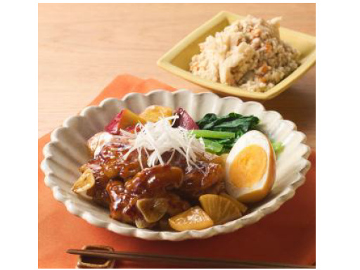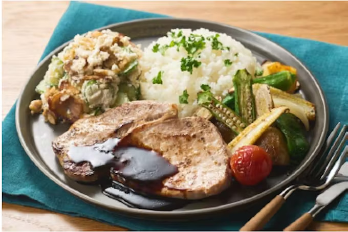 「[腸内環境ごはんKit]にんにく香る!鶏とさつまいもの黒酢煮 2人前」は、食物繊維が豊富な食材を使用した。黒酢の酸味とにんにくの香りが食欲をそそる甘辛い炒め煮は、ごはんがすすむ味わいとなっている。隠し味の味噌マヨネーズが効いたそぼろ入りのおからと一緒に食べてほしいという。