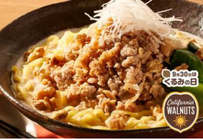 「[腸内環境ごはんKit]くるみ入り肉みその豆乳坦々麺」は、豆乳とねりごまが入ったクリーミーな担々麺。子どもも食べられるよう辛さ控えめに仕上げており、好みで自宅のラー油などで調整してもらえる。肉みそには砕いたくるみを入れることで食べ応えアップ。甘酸っぱい中華風の和え物と一緒に食べてほしいとのこと(カリフォルニアくるみ協会とのコラボメニュー)。