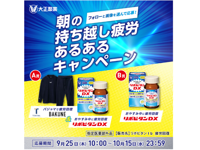 同時開催中の「大正製薬 朝の持ち越し疲労あるあるキャンペーン」は、6月のイベントで聴取した3つの「あるある」をイラスト化し、共感するものを選択して投稿することで応募できるX上のオープンキャンペーンとなっている。
