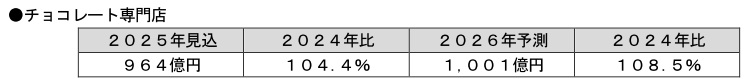 2025年は、カカオ豆価格の高止まりや夏場の長期化による需要減退といった懸念がある中、参入各社は焼き菓子や半生菓子など、カカオ含有量が少ない商品の開発に注力している。原料高騰などによって価格改定の動きが続いていることは将来的に参入企業の注力度低下につながる可能性もあるが、市場は短期的には拡大し2026年に1000億円を上回ると予測される。