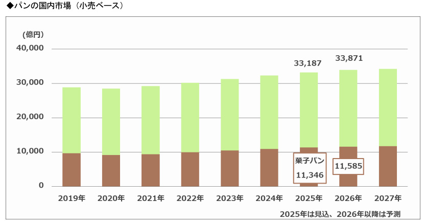 2025年の市場は3兆3187億円と見込まれる。流通パンは価格改定に伴い価格訴求品の消費者ニーズが一層高まっており、割高感があるハーフサイズ(2枚・3枚入り)の食パンなどが苦戦しているものの、単価上昇により伸びを維持するとみられる。ベーカリーでは個人店の苦戦が続く一方、量販店インストアベーカリーは、参入企業の注力度が高く市場をけん引するとみられる。