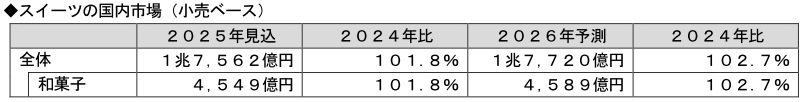 2025年も、スイーツショップでは手土産需要や自家需要が好調であるほか、流通スイーツは多くの品目で季節感を訴求したフレーバー展開や新商品が投入されており、市場の伸びが続くとみられる。