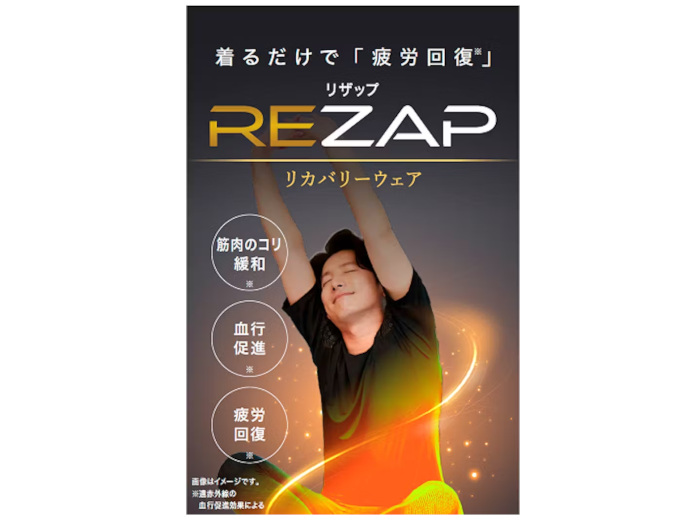 「REZAP」は、家庭用遠赤外線血行促進用衣として一般医療機器の届出を済ませたリカバリーウェアブランド。着用するだけで血行を促進し、筋肉のコリ緩和や疲労回復をサポートする(遠赤外線の血行促進効果による)。最大の特長は火山灰を練り込んだ生地と、鉱石ラバーをプリントしたRIZAP独自の素材設計となっている。素材特性を活かし、身体のコンディションを整えやすい着用感を追求した。また鉱石を含んだラバーを現代人の悩みの深い箇所に配置するなど、解剖学、運動力学、生理学に基づくトレーニングを研究してきたRIZAPだからこそ可能な商品仕様となっている。
