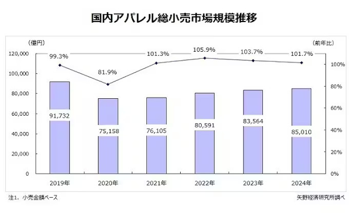 矢野経済研究所、国内アパレル市場に関する調査、2024年の総小売市場規模は8兆5010億円で前年比101.7%に