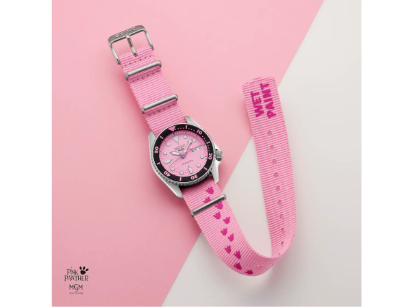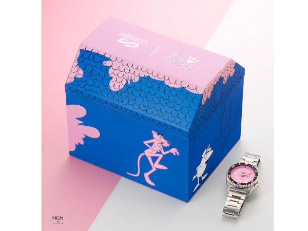 同作は<セイコー 5スポーツ>SKXシリーズをベースに、オリジナル短編アニメーション第一話「The Pink Phink(ピンク騒動)」の世界を表現したモデルとなっている。ピンクパンサーがいたずらをして、リトル・マンの家をピンク色に塗り替えるストーリーを、腕時計全体で表している。