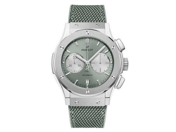 45mmのモデルは、ウブロがデザインした初めてのセージグリーンダイアルのクロノグラフ。「バランス」をコンセプトに、スポーティなクロノグラフの機能性とセージグリーンの柔らかな印象が見事に融合している。新しいパステルトーンは、シルバーのカウンターとサークル状のスネイル仕上げによって強調された、ウブロのクロノグラフの本質的な特徴と調和している。