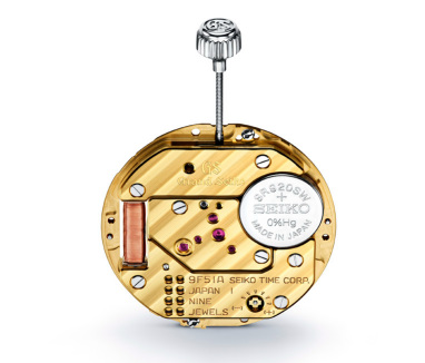 「クオーツを超えたクオーツ」を究めてキャリバー9Fは1993年に誕生した。年差±10秒の高精度を実現し、細部にも工夫を凝らした最高峰のクオーツムーブメントは、それまでの常識を覆した。そして同作に搭載される新ムーブメントは、キャリバー9Fの中で最もシンプルなムーブメント「キャリバー9F61」の精度・性能はそのままに、長径を0.6mm小型化した「キャリバー9F51」となっている。クオーツでは困難だった重い針を動かすことを可能にした「ツインパルス制御モーター」、秒針を美しく回転させるためにふらつきを軽減する「バックラッシュオートアジャスト機構」、長期にわたる使用で進みがち、遅れがちという傾向が判明した時には精度調節ができる「緩急スイッチ」など、キャリバー9Fが誇る機能を搭載している。