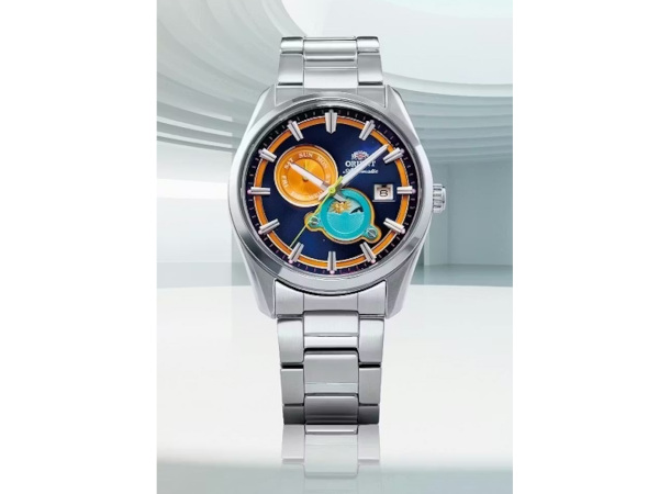 今年春夏シーズン限定モデルとして発売される「オリエントストレット サンアンドムーン」は、「オリエントストレット デイト」の26年春夏シーズン限定モデルの文字板を彩る4色をすべてひとつのダイヤルに取り込む試みが成されている。太陽と月のモチーフで1日の昼夜を示す4時位置のサンアンドムーン表示部はブルー、10時位置の指針式の曜日表示と楔型インデックスの下をくぐる同心円のサークルはオレンジ、アクセントとしてピンクの分目盛、秒針にグリーンというように、実にカラフルな配色が目を奪う。