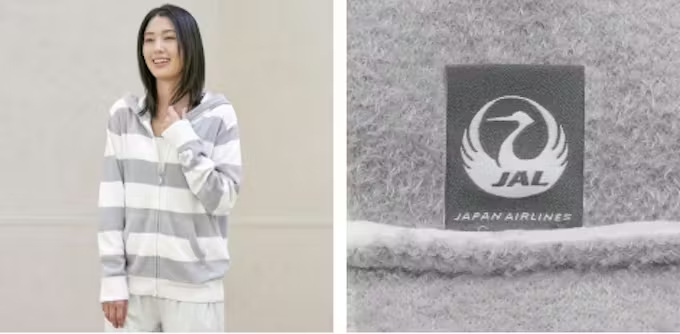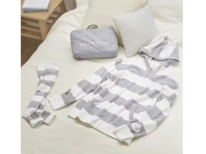 gelato piqueの寝具ライン「gelato pique Sleep(ジェラート ピケ スリープ)」とのコラボレーションアイテムとして、JALロゴ入りのパーカと着圧ソックスに、収納ポーチの付いた3点セットを販売する。
