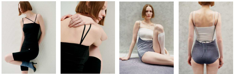 「Mizuno×Ameri 2WAY TUBE TOPS」は、ストラップを取り外しチューブトップとしても着用可能な、カップ付きキャミソールインナー。一本のラインで構成したストラップは、あえて見せてもスタイリングの一部として楽しめるデザインに仕上げた。