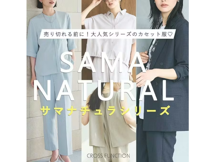 「CROSS FUNCTION(クロスファンクション)」は、3月6日からオンラインストアで「シワになりにくい」「マシンウォッシャブル」「UVカット」「接触冷感」機能が備わったサマナチュラシリーズ8型の販売を開始した。ビンテージ加工を施したリネン調の素材を使用し、ブラウス、パンツ、ジャケット、オールインワンと通勤服から日常着まで組み合わせ自由なセットアップの着方ができるカセット服として提案している。