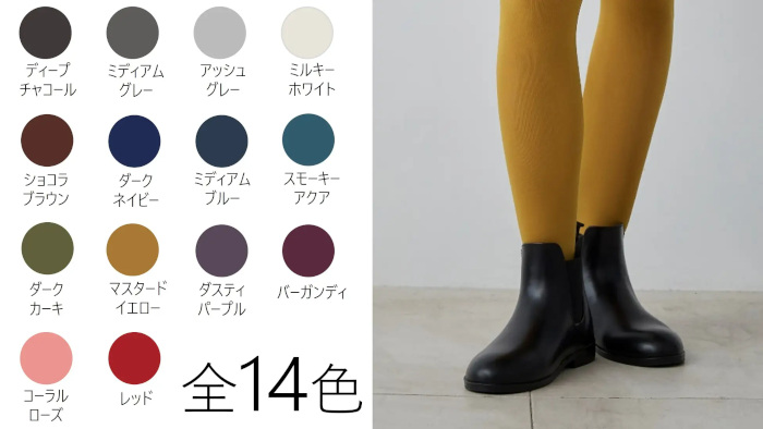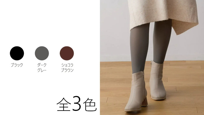 「裏起毛フェイクカラータイツ」は、見た目は薄手のカラータイツのような透け感がありながら、内側は裏起毛でしっかり防寒。合わせやすく、脚もとが重くなりすぎないカラー展開となっている。