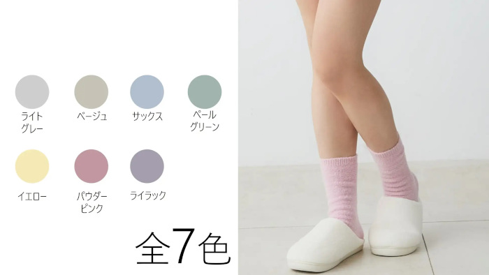 「シャギーソックス」は、長すぎず短すぎない25㎝の丈。内側は裏起毛であたたかく、寒い日もおうち時間を快適に過ごせる。お気に入りのルームウェアに合わせて選べる7色展開となっている。