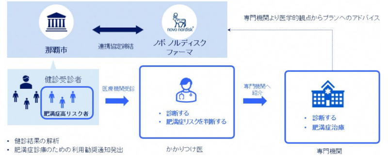 対象者は、体格指数(BMI)が35以上の健診受診者で、20~74歳の国民健康保険加入者、または加入医療保険で健診を受ける機会のない20~39歳までの者。各社の役割は、ノボ ノルディスク ファーマでは、市民および医療従事者への疾患啓発と、那覇市における好事例の発信と全国への普及を担う。那覇市では、市民への疾患啓発と、医師会および医療機関との調整を担う。