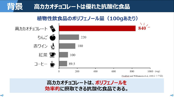 続いて、同大学 体育学部 助教の秦麗ら氏が、「筋力トレーニング前の高カカオチョコレート摂取による効果」に関する研究結果について解説した。「筋力トレーニングは健康の維持増進に寄与するが、高強度で行った場合、動脈硬化度を増加させるリスクがあることがわかっている。一方で、高カカオチョコレートはカカオポリフェノールを多く含む抗酸化食品であり、動脈機能の改善など科学的に裏付けられた多数の健康効果が報告されている。そこで、高強度筋力トレーニング前に高カカオチョコレートを摂取することで、運動による動脈硬化度の増加を軽減することができるのではないかと考え、研究に取り組んだ」と、研究の目的を紹介。