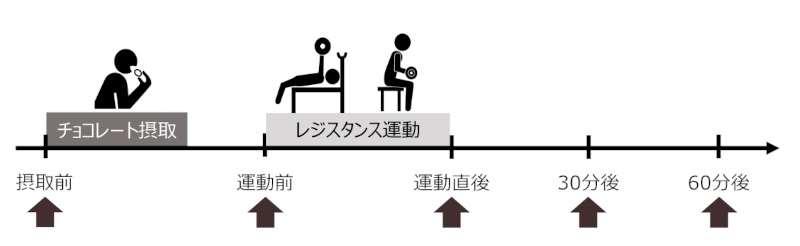 「研究では、運動習慣のない健康な成人男性12名を対象に、カカオポリフェノールを含む高カカオチョコレート、または含まないホワイトチョコレートを摂取した後、高強度レジスタンス運動(ベンチプレス、アームカール)を実施。チョコレートを食べる前と摂取60分後、運動直後、そして運動終了後30分と60分に、血圧と中心動脈硬化度(頸動脈コンプライアンス、βスティフネスインデックス)、全身性動脈硬化度(上腕-足首間脈波伝播速度(baPWV))を測定した」と、研究方法について詳しく説明した。