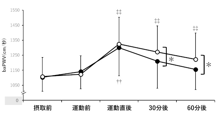 †† 高カカオチョコレート:摂取前 vs. 各測定ポイント P<0.01