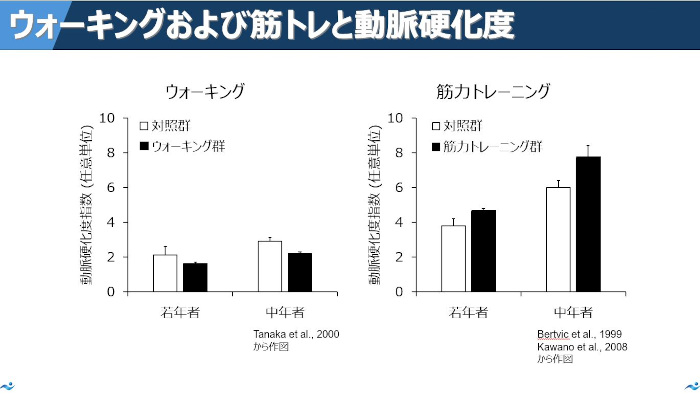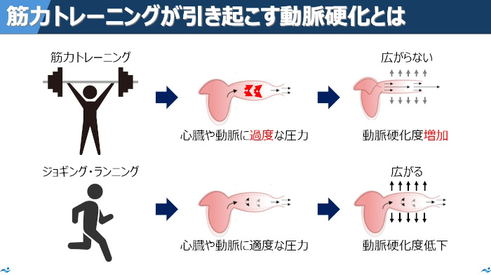 「日本では近年、筋力トレーニングの人口が増加傾向にあり、健康寿命延伸に対する効果としては筋力・筋量の増加や骨密度の増加が期待されている。しかし、筋力トレーニングには、関節などへの負担増や動脈硬化度の増加といったデメリットもある。特に動脈硬化度については、ウォーキングでは指数が低下する一方で、筋力トレーニングでは増加することが研究結果からも明らかになっている」と、筋力トレーニングには動脈硬化度を増加させるリスクがあると訴える。
