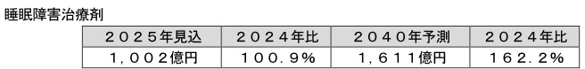 ん引している「デエビゴ」の特許が切れるが、今後発売される新薬への処方シフト、新薬による潜在患者の掘り起こしが進むとみられ、市場は引き続き拡大すると予想される。