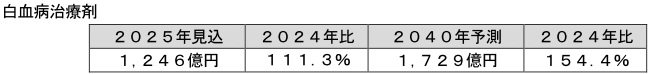 白血病治療剤の市場は、分子標的治療剤が90%前後を占める。分子標的治療剤ではTKI阻害剤「スプリセル」(ブリストルマイヤーズ スクイブ)、「タシグナ」や「グリベック」(いずれもノバルティス ファーマ)がジェネリック医薬品の発売や薬価引き下げによって実績が縮小しているが、二重特異性抗体「ビーリンサイト」(アステラス製薬)、STAMP阻害剤「セムブリックス」(ノバルティス ファーマ)などは伸びており、市場拡大をけん引している。今後短期的には、引き続き「ビーリンサイト」や「セムブリックス」など分子標的治療剤が市場をけん引していくとみられる。「ビーリンサイト」は、急性リンパ性白血病の2次治療において有効性が評価されているが、1次治療への適応拡大がフェーズⅢ段階にあり、承認されれば急激に処方が増加すると予想される。「セムブリックス」は、慢性骨髄性白血病の2次治療における使用にとどまっているが、2025年5月に1次治療の承認を取得しており、今後は1次治療の標準治療薬になると期待される。中長期的には現状の主要な分子標的治療剤の伸長はピークアウトする可能性があるが、新薬候補は豊富であることから市場は拡大が続くと予想される。特に、二重特異性抗体が急性リンパ性白血病治療において期待度が高く、今後さらに処方が広がっていくとみられるほか、急性骨髄性白血病においてはFLT3阻害剤やIDH阻害剤の有効性が海外で既に評価されており、今後処方が増加していくとみられる。