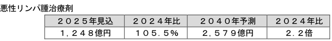 悪性リンパ腫治療剤は、分子標的治療剤、CAR-T療法、免疫チェックポイント阻害剤、その他抗がん剤に大別される。市場は、分子標的治療剤が75%程度を占める。近年、分子標的治療剤である抗CD79b抗体薬物複合体「ポライビー」(中外製薬)、抗CD30抗体薬物複合体「アドセトリス」(武田薬品工業)、BTK阻害剤「ベレキシブル」(小野薬品工業)が市場をけん引している。2024年は、「ポライビー」と「アドセトリス」などの市場拡大再算定の対象となった分子標的治療剤をはじめ、CAR-T療法、免疫チェックポイント阻害剤、その他抗がん剤の全てが前年比減少となり、市場が縮小した。2025年は、「ポライビー」が実績を回復させるほか、2023年以降に発売された新製品の伸長が寄与し、市場は拡大するとみられる。今後短期的には「ポライビー」やその他近年発売された分子標的治療剤、CAR-T療法がけん引し、市場は拡大推移を維持するとみられる。特に、2023年11月に発売された抗CD20/CD3抗体「エプキンリ」(ジェンマブ)が濾胞性リンパ腫の2次治療で処方を伸ばしており、濾胞性リンパ腫やびまん性大細胞型B細胞リンパ腫の1次治療においてもフェーズⅢ段階にある。中長期的には「ポライビー」「アドセトリス」「ベレキシブル」の伸長がピークアウトする可能性があるが、悪性リンパ腫の患者数および治療患者数は高齢化や診断技術の向上によって増加しているうえ、新薬の発売も活発であり、新薬候補も豊富であることからそれらの発売によって市場は拡大が続くと予想される。新薬候補は二重特異性抗体とCAR-T療法に多く、両剤への期待度は以前よりも高まっていることから、将来的には従来の化学療法剤がこれらへとシフトするとみられる。