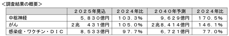 この調査では、3領域の医療用医薬品市場について、薬効分類別、医薬品区分別に現状を把握し、開発品や政策の動向、パテントクリフなどを加味して2040年まで展望した。