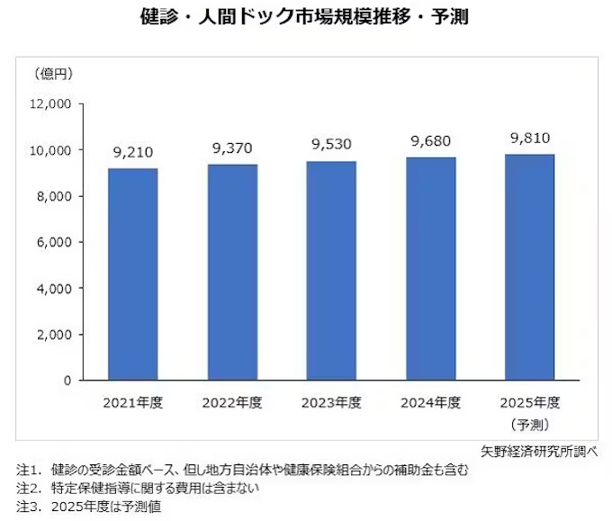 矢野経済研究所、健診・人間ドック市場に関する調査、2025年度の市場規模は前年度比1.3%増の9810億円と予測