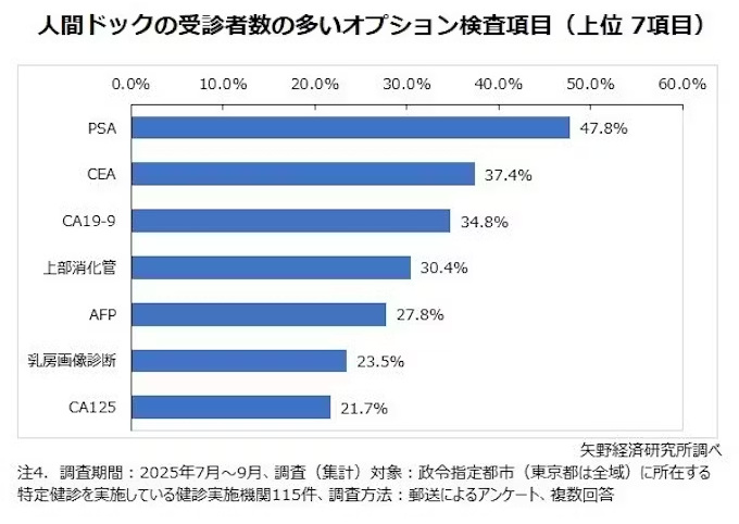 健診施設では、受診者受け入れ拡大のため、他施設との差別化ポイントの1つとして受診者のニーズに対応した人間ドックのオプション検査を導入することで、受診者の獲得を図っている。同調査に関連し、2025年7~9月に健診実施施設に対して郵送アンケート調査を実施し、115件の回答を得た。