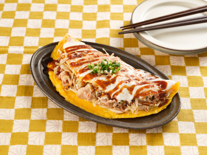 「とん平焼きヨーグルトソース」は、胃への負担が少なく栄養価の高い卵と胃腸の回復を助けるキャベツを活用した、胃に優しいとん平焼き。胃の負担を大きくする脂であるマヨネーズは、ヘルシーで胃腸の動きを活発にしてくれる働きがあるヨーグルトに変えることで、胃腸の回復の助けになるよう工夫している。