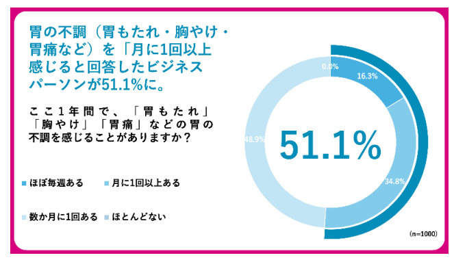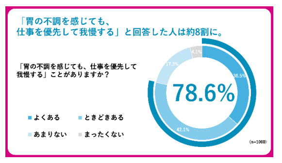 また、「胃の不調を感じても、仕事を優先して我慢する」と回答した人は「よくある」(36.5%)、「ときどきある」(42.1%)とあわせて78.6%に達し、約8割のビジネスパーソンが不調を抱えながら働いている実態が明らかになった。