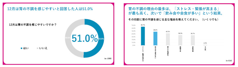 エーザイ コンシューマーhhc事業部は、年末の多忙な時期を迎えるにあたり、全国の20~60代の働くビジネスパーソン1000名を対象に、「胃の不調と仕事パフォーマンス」に関する実態調査を実施した。同調査では、胃の不調(胃もたれ・胸やけ・胃痛など)を「月に1回以上感じる」と回答したビジネスパーソンが51.1%に上ることが判明した。特に、12月は胃の不調を感じやすいと回答した人が51.0%と半数を超えており、その主な理由として「ストレス・緊張が高まる」(65.7%)が最多で、次いで「飲み会や会食が多い」(48.2%)が上位を占め、年末ならではの理由が見受けられた。
