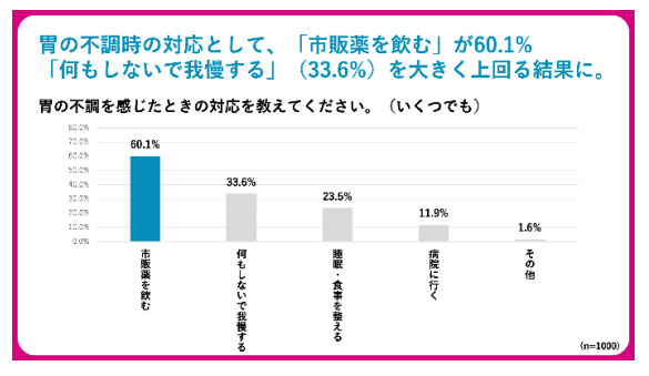 一方、胃の不調時の対応として「市販薬を飲む」人が60.1%と最多だった。これは、市販薬を活用した能動的なセルフケアを通じて、中断できない仕事のパフォーマンスを維持しようとする現代の働き方を反映している。