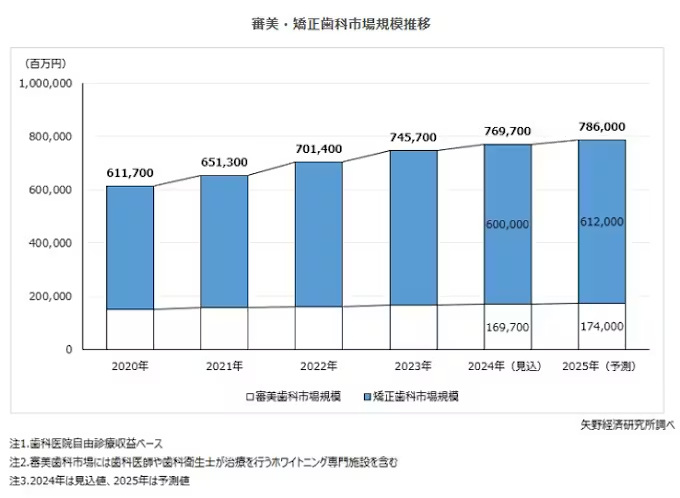 矢野経済研究所、審美・矯正歯科市場に関する調査、2024年の市場規模は前年比103.2%の7697億円の見込