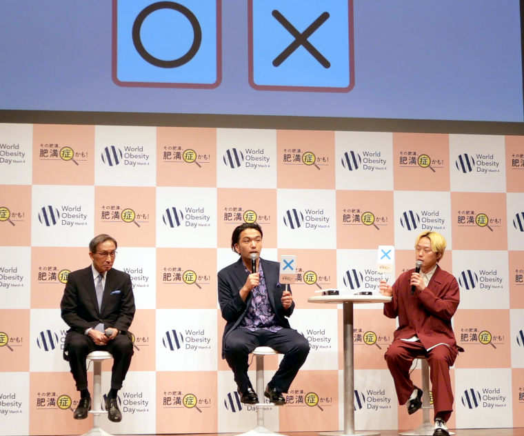 この後、盛山さんの減量体験を踏まえて、見取り図の二人に「肥満症」に関するクイズに挑戦してもらった。まず「太る原因は単に自己管理ができていないから」という問題に、二人とも「〇」と回答し、結果は不正解。宮崎先生は、「肥満について研究が進んだ今、『意思が弱いから太る』という単純な原因ではないことがわかってきている」と解説してくれた。第2問「肥満症は『太っている状態』を指す言葉である」には「×」、第3問「肥満症の治療について医療機関に相談することができる」には「〇」と回答し、二人とも見事正解。クイズを通して、「肥満」と「肥満症」は違うもので、肥満症は治療の対象であること、専門家に相談できる病気であることなどを学び、肥満症への理解を深めた様子だった。