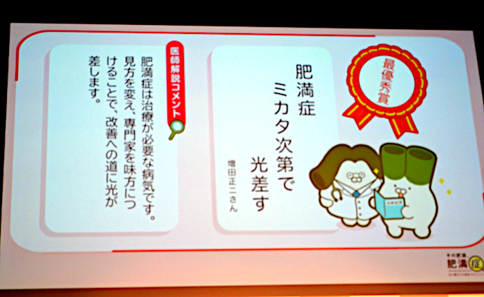 また、イベントの最後には、全国から一般募集した「肥満症のただしいミカタ川柳」の結果および受賞作が発表された。「肥満症のただしいミカタ川柳」は、「その肥満、肥満症かも!」プロジェクトの一環として行われたもので、全国から寄せられた数多くの応募作品の中から、肥満症への理解を深め、味方を変える力を持つ8作品(最優秀賞1作品、優秀賞2作品、特別賞5作品)が選出された。