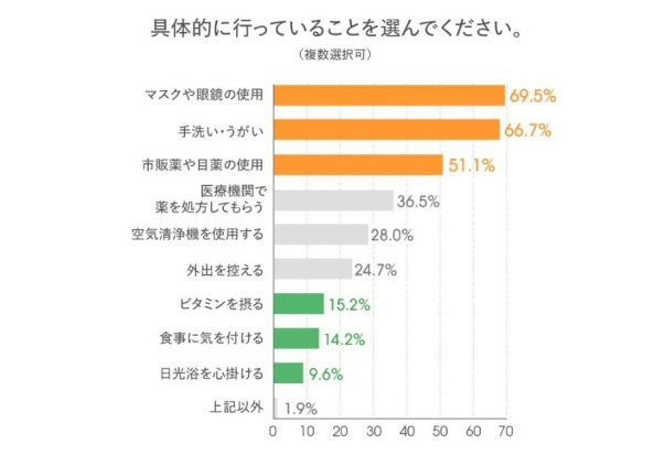 花粉症対策としては、「マスクや眼鏡の使用」「手洗い・うがい」「市販薬の服用」など花粉を外から防ぐための対策が高い実施率を占め、多くの人が日常的に取り入れていることがわかった。一方で、「日光浴を心がける」「ビタミンを摂る」「食事に気を付ける」といった、体の内側を整えるケアの実施率はわずか1~1.5割にとどまっている。原因(免疫の過剰反応)を認識していても生活行動に十分結びついていない、“内側ケア”不足が明らかになった。