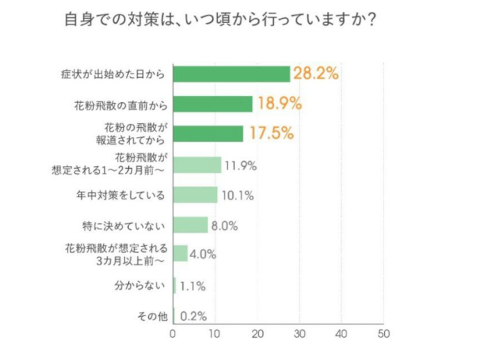 対策を始める時期に関する調査では、「花粉飛散の直前から」「花粉の飛散が報道されてから」「症状が出始めた日から」と回答した人が6割超という結果だった。多くの生活者が慌てて対策を開始しており、十分な準備期間を確保できていない可能性が示された。生活者の行動にはギャップがあり、“内側ケア”の広がりにくさにつながっていると考えられる。