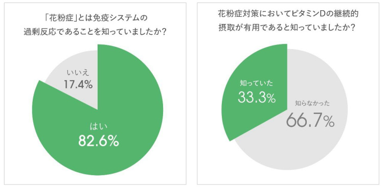 今回の調査では、花粉症が免疫の過剰反応によって起こることを理解している人は82%に達し、花粉症のメカニズム理解は広く浸透していることがわかった。また、ビタミンDの花粉症における有用性を認知している人も33%と、ビタミンDへの理解が広がりつつあることがわかった。
